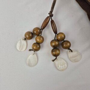Coldwater Creek Chocolate Brown Macrame Woven Wood Double Hoop Handle Bag. Double wood hoop handles with a woven basket weave design. Beaded tassel with sea shell like accents. Interior has a zipper pocket and 2 slip pockets. Top closure has two magnetic snaps. The waxed knotting gives the look of leather, fully lined. Very light weight. Great for travel. Preowned- in great condition. Please see pictures for approximate measurements. Boho, bohemian, hippie, beachy, beach, coastal, vacation, poolside, travel, cruise.