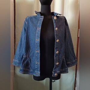 Chic blue jean jacket with button-up front and at cuffs. Perfect for layering. Timeless style from Coldwater Creek. Fitted. Pre-owned. Loose top and bottom button. See pictures. They are part of the description. Measurements are approximate.