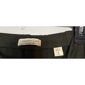 Coldwater Creek Classic Fit pull-on pants in deep olive green with a high rise and wide leg—sleek, stretchy, and ideal for work or travel.