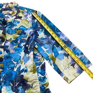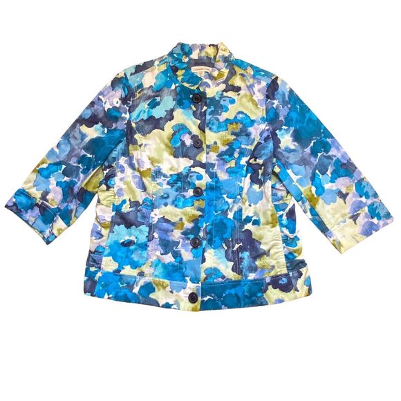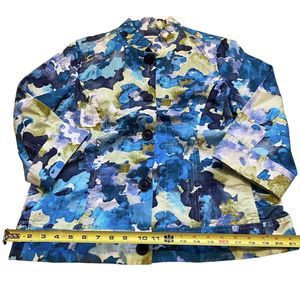 Coldwater Creek Cotton/Linen Blue Multi Abstract Floral Ruffle Neck Jacket Sz 12