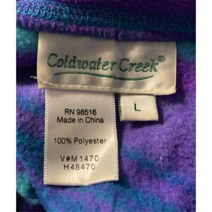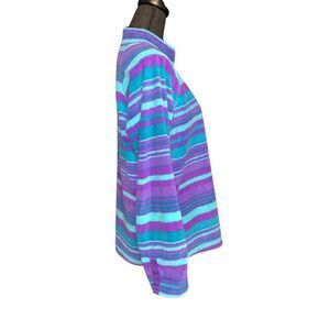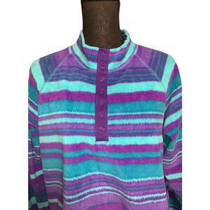 Purple and aquamarine multi striped fleece pullover sweatshirt. Quarter snap button closure. Long sleeve with snap button cuff. 100% polyester. Size: large. Preowned in good condition.
