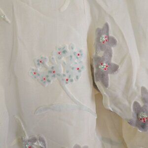 Elegant Coldwater Creek jacket featuring a cream flocked design with beaded details. Open front with a vintage, unique look. Lined with a silk blend for luxurious comfort. Note: small spot as pictured.