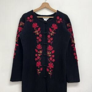 Coldwater Creek Floral Embroidery Velvet Boho Frog Button Wool Sweater Jacket - Med