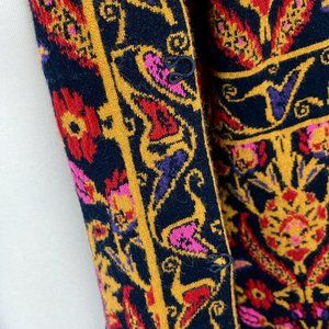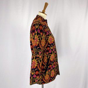 Floral Filigree Sweater Jacket offers a dramatic mix of color and pattern in a knitted-in allover design with border accents. Hidden hook and eye closures, angled slash pockets.