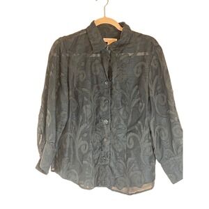 Keywords: Coldwater Creek, floral burnout, sheer blouse, button-up top, petite medium, PM, long sleeve, womens top, collared blouse, party top, dressy casual, ladies blouse, vintage inspired, 80s