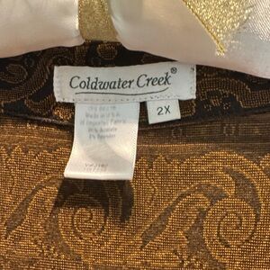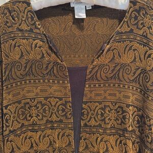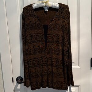 Elegant top with intricate gold and black patterns. Ideal for stylish occasions. Plus size 2X. Long sleeve. Very comfortable. Non-wrinkly. Perfect for fall. Great condition!