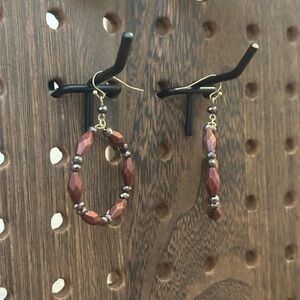 Elegant set of two earrings. Gold pair with oval design. Red pair with circular bead pattern.