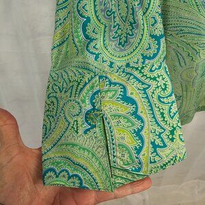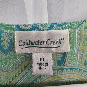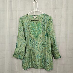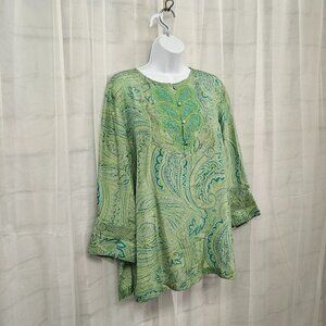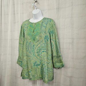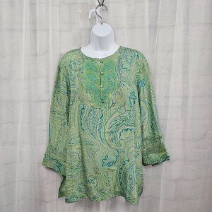 Coldwater Creek Green Blue Paisley Silk Blouse Peasant Retro Embroidered PL