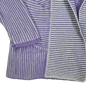 Chunky knit of purple and gray give this sweater a striped, heathered look. The collar is relaxed and falls with a shawl appearance.