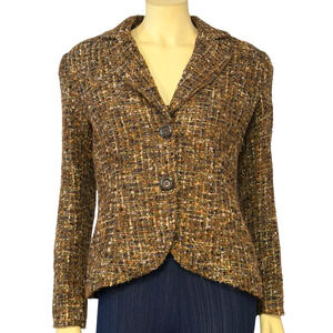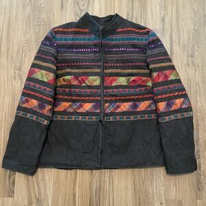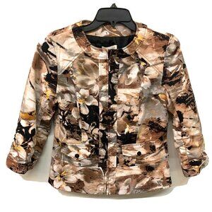 Very fun & comfortable jacket! Many colors to match with! XS is like a 4/6 (Bust 35/36). This is long-sleeve and buttons down the front.