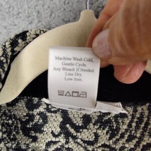 A vintage Coldwater Creek jacquard tapestry blazer type jacket. Three velvet covered buttons - one at the collared neckline and one each on the slit pockets. Upturned black velvet cuffs. The jacket is unlined which makes it a nice lighter weight covering. The color is a beige tone and black combination. Great condition for a vintage piece.
