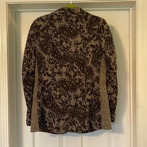 Fully lined light to medium weight jacket / blazer in rich brown and tan by Coldwater Creek in good condition. Two button closure featuring two front flaps for design only - no pockets.
