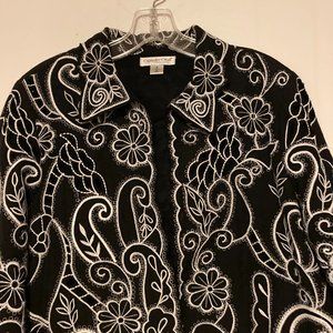 Coldwater Creek Jacket Size 6 Embroidered Floral Black and White 3/4 Sleeve
