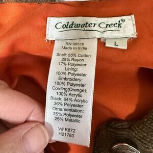 The Coldwater Creek Jacket is a women's size large brown tapestry jacket with embroidered floral accents, perfect for travel, casual, or business occasions. Made from a blend of cotton, polyester, and rayon, this short jacket features long sleeves, a button closure, and a polyester lining. With a regular fit, it is lightweight and lined, making it ideal for winter, fall, or spring wear. The bohemian and classic theme adds a stylish touch to this basic jacket from the brand Coldwater Creek.
