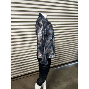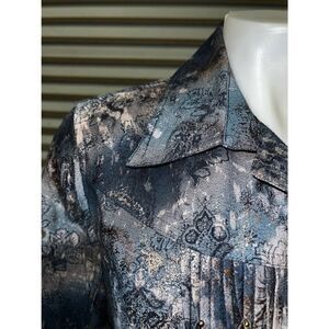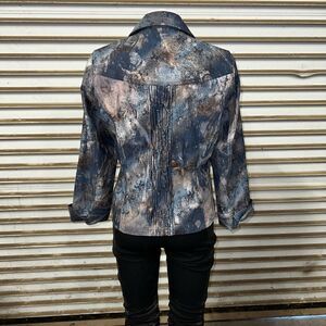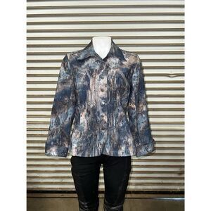 Coldwater Creek Jacket Blue Grey Floral Metallic Demask Print snap front bead