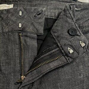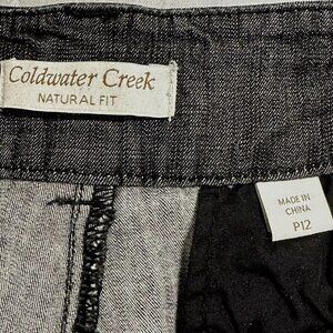 This is a pair of Coldwater Creek women's jeans in size 12P with a natural fit and straight, wider leg design. Made of a stretch denim fabric blend of spandex and cotton, these black jeans feature a medium wash and have a 32-inch waist size with a 10.5-inch rise. They come with a zip, button, and hook & eye closure, and have slash pockets for convenience. With a classic style and comfortable features like stretch and easy care, these jeans are suitable for various themes such as hipster, hippie, bohemian, and college wear across different seasons.