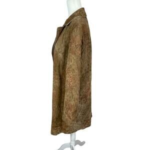 100% soft suede leather long line open front trench style jacket. A muted, subtle allover floral leopard pattern. Size large. Please see photos for measurements.