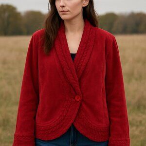 Unique and eye-catching, this Coldwater Creek jacket combines red leather/suede panels with cozy cable knit sleeves and trim. Featuring a tie-front closure with button detail, it’s a statement layering piece that blends rustic charm with modern design.