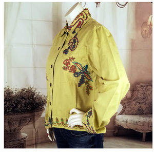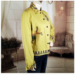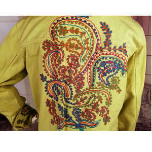 Coldwater Creek Boho Embroidered and Denim Jacket. A mixture of colorful embroidery and studs on a light lime green solid color. It has embroidery on the cuffs, front, collar, back and bottom edges. The jacket is in excellent condition without defects or signs of wear.