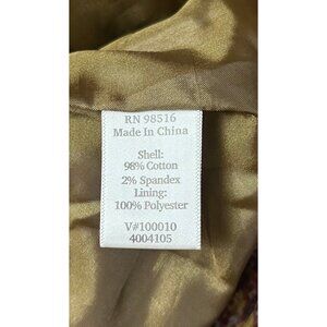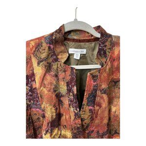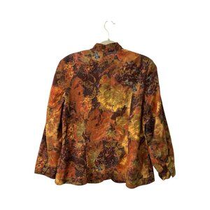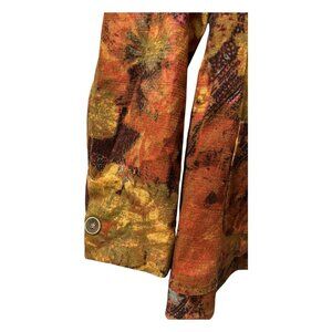 Beautiful lined jacket in colors of yellow, gold, red, and green. She has 2 front pockets, long sleeves is padded in the shoulders for added form. The shoulder pads are beneath the lining, thus not easily removed. The buttons are beautiful, as is the lining. Beautiful condition.