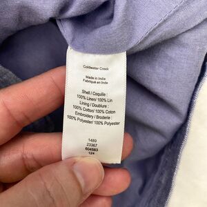 Material tags confirm: Shell 100% Linen, Lining 100% Cotton, Embroidery 100% Polyester.