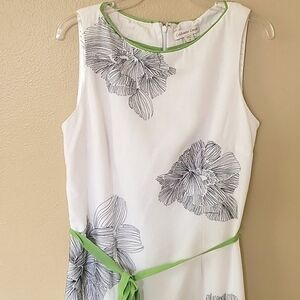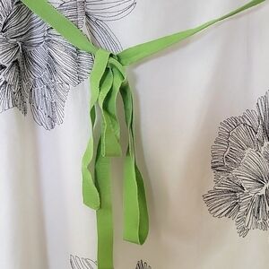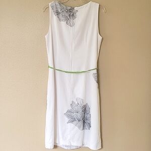 EUC Coldwater Creek linen blend midi shift dress with black embroidered flowers and has a green belt and zipper back