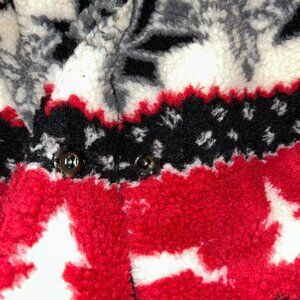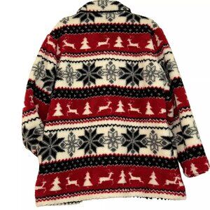 DESCRIPTION: Snuggle up and head outdoors in this bright and cheerful Nordic Sherpa Jacket from Coldwater Creek. Striking Red, Black and Ivory pattern that's perfect for the Holidays, relaxed fit, pockets and snap front closure. So warm and cozy!
