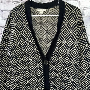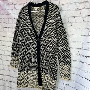 Coldwater Creek black and beige , geometric print, long duster style open front sweater with one button optional closure. Size Large (14)