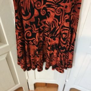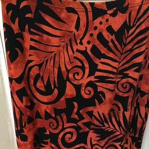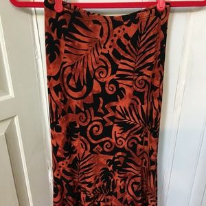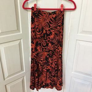 Coldwater Creek orange and black stretchy tribal skirt with elastic waist and large ruffle on the bottom. Super cute!