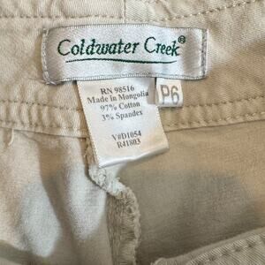 These are classic and versatile cropped trousers from Coldwater Creek, labeled a Petite Size 6 (P6). They are made from a comfortable stretch blend of 97% Cotton and 3% Spandex in a neutral, light khaki/beige/stone color. The pants feature a flattering mid-rise, straight-leg cut that ends in a cropped length.