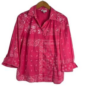 Coldwater Creek Pink Floral Print 3/4 Sleeve Handkerchief Button Front Top Sz PL
