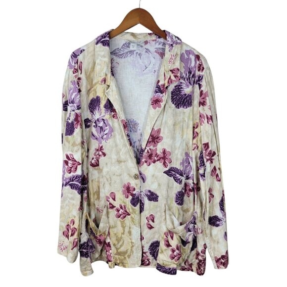 Coldwater Creek Plus Size 2X Linen Jacket blazer Floral Iris Tan Purple Pockets