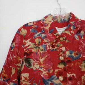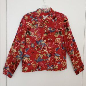 Coldwater Creek red floral jacket blazer, versatile light jacket, button front, long sleeves, single button cuffs, lined. Great with jeans or office casual. textured nubby fabric.