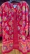 Vibrant red jacket with colorful floral patterns. Open front design. Three-quarter sleeves. Perfect for layering.