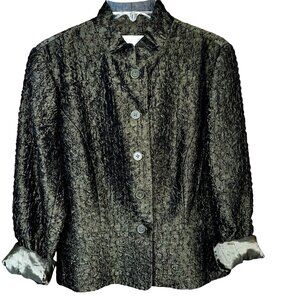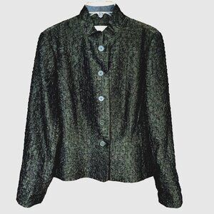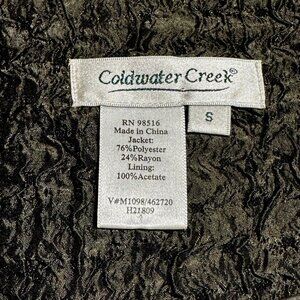 Elevate your fall wardrobe with this Coldwater Creek women's blazer in a rich dark green hue. Crafted from a ruched, crinkle-textured fabric, this lined jacket blends quiet luxury with cottagecore charm. Featuring a classic button-up front, structured collar, and flattering silhouette, it's perfect for career wear, vintage-inspired styling, or cozy fall layering. Size Small. Made with a premium polyester-rayon blend and fully lined in acetate for comfort and polish. Ideal for office chic, weekend outings, or transitional weather. A timeless piece that channels understated elegance and seasonal versatility.
