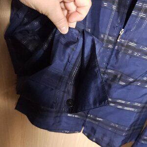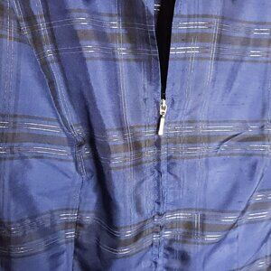 Coldwater Creek women’s silk blend blue plaid full zip lightweight blazer jacket metallic accents large. Gently used condition. Measurements are: 26” sleeve, 24 ½" from shoulder to hem, and 21” from armpit to armpit.