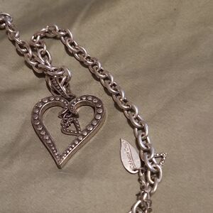 The Coldwater Creek Silver Heart Pendant Necklace features a beautifully crafted heart-shaped pendant adorned with sparkling clear crystals. This elegant piece is suspended from a classic silver-toned chain, offering a timeless and sophisticated look. The necklace's polished finish and delicate shimmer make it a standout accessory for any occasion.