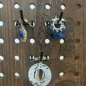 Elegant earring set featuring intricate silver designs. Includes heart-shaped and geometric blue accents.