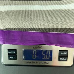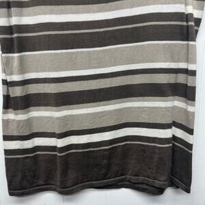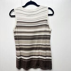 Coldwater Creek women's striped sweater/vest in neutral caramel colors. Sleeveless. Scoop neck. Ribbed trim. Has a small stain on the left shoulder, please see picture. In good used condition. No tears or holes.