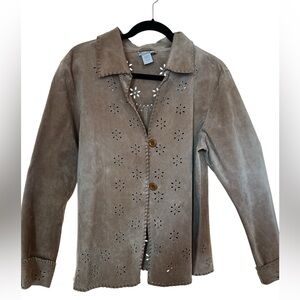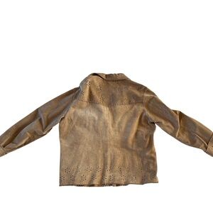 Elegant tan leather jacket with unique design. Ideal for versatile styling. There is a small spot on front of jacket. See photo where I’m pointing to it. I did not attempt to clean it. Otherwise in good condition. Perfect for fall!