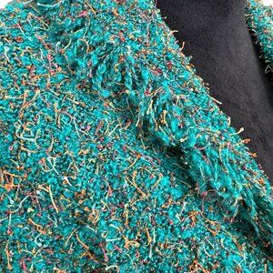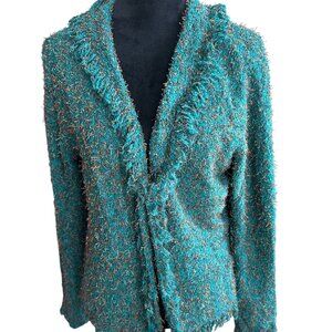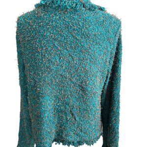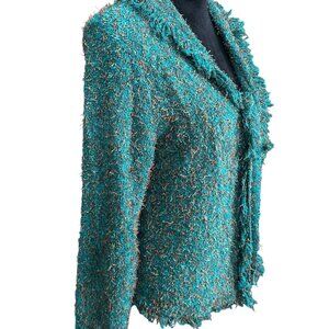 Stylish teal cardigan with textured design. Perfect for layering. Single hook closure. Size L in good used condition.
