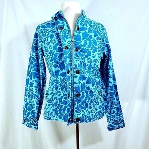 Coldwater Creek lightweight denim jacket in beautiful bold turquoise and blue colors with large floral print throughout. Front zipper with snap overclosure. Good pre-owned condition.