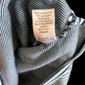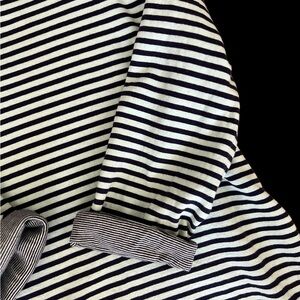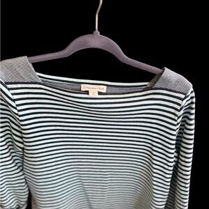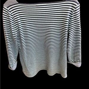 Two-toned Blue top elbow length sleeves. Size M (10-12) Cotton/Nylon fabric washable. No stains, See measurements in photo