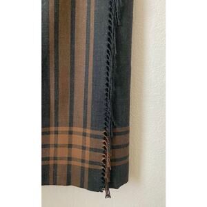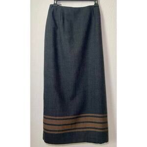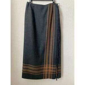 Coldwater Creek Vintage Shawl Wrap Maxi Skirt XL Beautiful Dark Charcoal W/ Copper Brown Accent Stripes and Fringe On The Side. It has lining & dark gray/black button of the side of skirt. There is also a button on the inside to keep the wrap skirt in place. This skirt is very elegant looking and would look great with a beautiful blouse and boots.