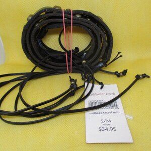 Never Worn Coldwater Creek with original tag $34.95 brass tone studded k knotted tassel narrow black genuine leather belt size S/M Small / Medium women's belt.