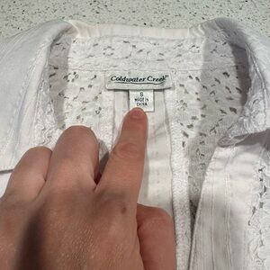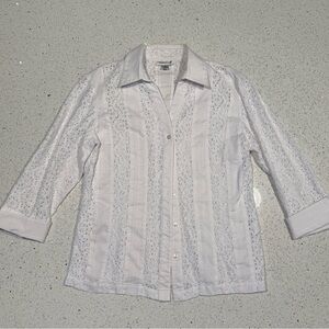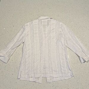 Elegant white blouse with intricate lace details. Ideal for versatile styling.