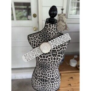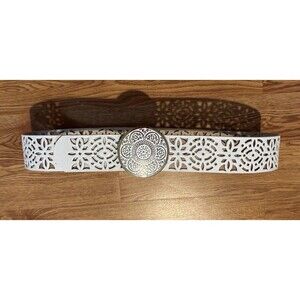 The Coldwater Creek White Leather Belt with a Large Silver Tone Buckle in size XL is a stylish accessory for women. Made from high-quality leather with metal gold tone hardware, this fashion belt features a solid white color and a normal width of 2 inches. The belted design is accented with a medallion, making it a versatile choice for various outfits. Whether you're going for a Bohemian or Classic look, this belt adds a touch of personality to any outfit while providing a secure closure with the buckle.