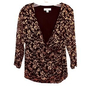 Coldwater Creek Wms Med Black Gold Floral Lace Mesh Overlay Surplice Top Formal