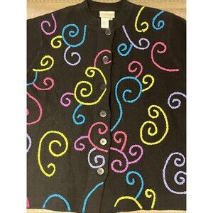 Coldwater Creek Womans Medium Black Swirl 100% Wool Button Cardigan Sweater
