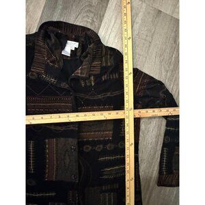 This Coldwater Creek jacket offers a stylish touch with its geometric pattern. Designed for women, it features an elegant blend of black and brown. A versatile choice for layering, this jacket adds sophistication to casual or semi-formal outfits.